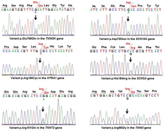In our study, five cases carried a known pathogenic variant in the following genes: TNNI3K (c.2302G>C, p.Glu768Gln, RCV000768402.5/Pathogenic, P3); HTRA1 (c.496C>T, p.Arg166Cys, RCV002291765.4/Pathogenic, P6); TNNT2 (c.452G>A, p.Arg151Gln, RCV000796707.6/Pathogenic, P8); SCN10A (c.2158G>A, p.Asp720Asn, VCV000532067.8/Pathogenic, P9); and SCN5A (c.515A>G, p.His184Arg, VCV000201540.5/Likely pathogenic, P12). Another four patients carried known variants in the following genes: KCNA5 (c.683C>A, p.Pro228His, VCV002202820.2, P4); MYBPC3 (c.2275G>A, p.Glu759Lys, VCV000843772.16, P5); CSRP3 (c.298C>T, p.Arg100Cys, VCV000851709.9, P10); and TNNI3 (c.292C>G, p.Arg98Gly, VCV001331910.2, P13). Based on the prediction results using prediction tools, three of these variants (KCNA5, P4; MYBPC3, P5; TNNI3, P13) were predicted to be likely to cause disease in the cases. However, the variant c.298C>T, p.Arg100Cys in the CSRP3 gene was not confirmed as the cause of the disease in case P13 (A in Table 3).