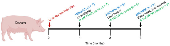 This study was performed at the University of Illinois at Urbana-Champaign under approval from the Institutional Animal Care and Use Committee. All animal procedures were performed in accordance with accepted animal welfare standards in a facility that is accredited by the American Association for Accreditation of Laboratory Animal Care (AAALAC) and the Office of Laboratory Animal Welfare (OLAW) of the National Institutes of Health, compliant with the United States Department of Agriculture Animal Welfare Act and Public Health Service Policy on the Humane Care and Use of Laboratory Animals. Two healthy 5-week-old female Oncopigs were initially used to test and optimize the MRI/MRE imaging protocol. Seven 8-week-old Oncopigs (six males, one female; mean weight 22 kg) were then enrolled as experimental subjects who underwent alcohol-based liver fibrosis induction, serial radiologic imaging, and successive biopsy procedures. A graphical representation of the experimental design is presented in Figure 1. The selected Oncopig cohort size and total number of radiologic exams for this pilot study reflected sample sizes typically used in exploratory pilot studies [13].