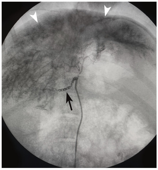 Fluoroscopic spot image demonstrates radiopaque ethanol-ethiodized oil staining of liver parenchyma (arrowheads) after fibrosis induction procedure (arrow denotes metallic coils in embolized gastroduodenal artery).