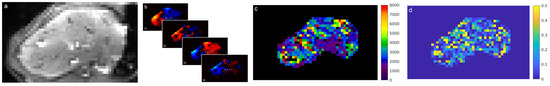 Liver MRE performed 1 month post liver fibrosis induction in Oncopig depicted in Figure 4. (a) Magnitude image from MRE acquisition. (b) Four time offsets for MRE actuation at 60 Hz with displacement encoding in z-direction (plus/minus subtracted). (c) Resulting stiffness map (μ, color scale in Pascals), and (d) damping ratio map (ξ, color scale unitless).
