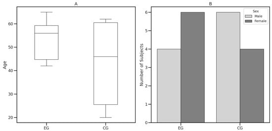 Demographic data. (A) Age distribution between groups. (B) Sex distribution between groups. EG = Experimental Group; CG = Control Group.