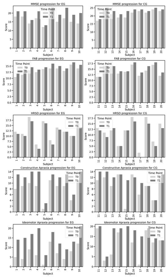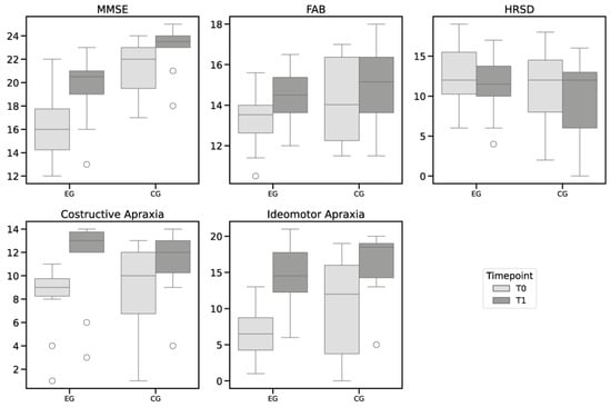 The Mann–Whitney test revealed significant differences between the EG and CG in the MMSE scores at both T0 and T1, with 95% CI from 2.13 to 4.67 (p = 0.002) and a 95% CI from 0.91 to 2.29 (p = 0.007) respectively, indicating a greater improvement in the EG. However, no significant differences were observed between the groups for the FAB scores at T0 (p = 0.306) and T1 (p = 0.568), HRSD scores at T0 (p = 0.761) and T1 (p = 0.704), constructive apraxia scores at T0 (p = 0.337) and T1 (p = 0.512), or ideomotor apraxia scores at T0 (p = 0.363) and T1 (p = 0.383).