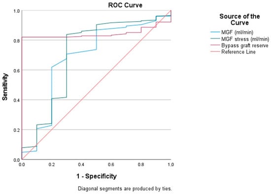 The graft patency was 96.2% after 16 ± 2 months, according to multislice spiral computed tomography coronary angiography. The ROC analysis demonstrated a statistically significant dependence of the graft patency on the MGF at rest, the MGF at stress and the CBFR. But the most significant dependence was demonstrated by the CBFR (p = 0.0001). Our study found that when the CBFR was less than 1.67 units (sensitivity 82%, specificity 100%), it correlated with postoperative (up to 16 months) graft failure according to coronary angiography.
