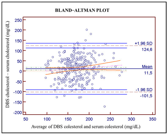 Bland–Altman plot (Figure 2) was used to evaluate agreement between DBS and serum cholesterol determination, revealing an average bias of 11.5 mg/dL (solid dark-blue line) with a 95% confidence interval in green dot-dashed line of 8.40–14.60 mg/dL. The computed limits of agreement corresponding to ±1.96 SD are from −101.5 to 124.6 mg/dL (dashed gray lines) with a 95% confidence interval (light solid blue lines). The Pearson correlation coefficient between the averages and the differences is 0.80 (95% CI: 0.76–0.84). Pitman’s test used with related samples gives a result of p < 0.001 which means that the two distributions have different levels of dispersion.