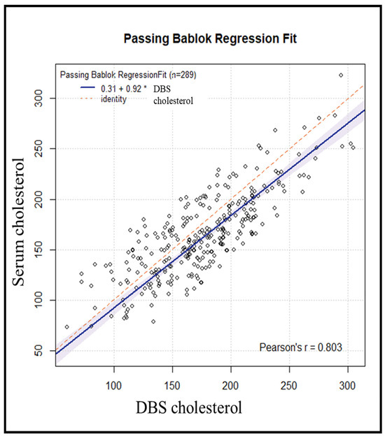 Passing–Bablok regression analysis of DBS cholesterol levels and serum cholesterol levels in 289 subjects (* = multiplication sign).