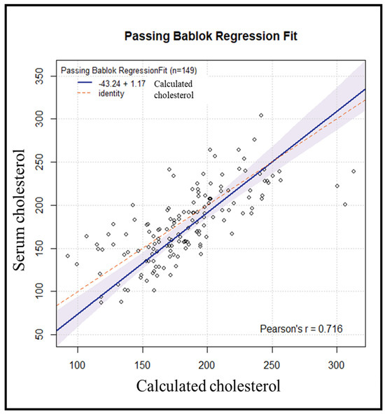 Subsequently, an internal validation of the method was conducted on 155 samples, processed in the same manner. Six samples were excluded due to variations > 50 mg/dL between repetitions. Using the previously obtained regression line, the cholesterol value for each subject was estimated from the resulting DBS cholesterol value. Comparing the results of serum cholesterol versus calculated cholesterol yielded a Passing–Bablok regression line with an estimated intercept of −43.24 [95% CI: −74.54–(−16.68)] with a corresponding estimated slope of 1.17 (95% CI: 1.03–1.35) (Figure 4).