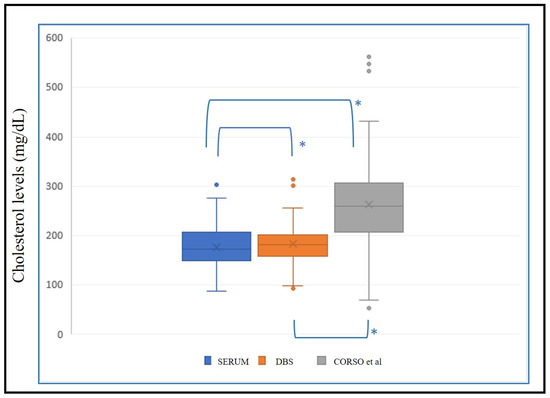 Box plot with levels of serum cholesterol, estimated cholesterol in DBS, and estimated cholesterol from external formula (Corso et al. [11]). *: p < 0.001.