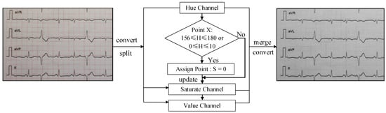 The hue and saturate channels in the HSV color space are used in the proposed algorithm. The lower and upper limits of the hue channel range are 0° and 180°, respectively, which are connected end-to-end in a ring. The ECG images confirm that the red grid to be adjusted corresponds to the hue channel between the [156, 180] and [0, 10] intervals [42] in which all points would be identified. To remove the grid, pixels with hue values within the interval can be converted to white by setting their saturation to zero. The completed process is illustrated in Figure 2.