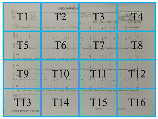 Among them, and are the input and output gray values and with the range in [0, 1]. After the normalization of the gray matrix, the gamma transform is conducted, and the gray matrix is remapped into a new grayscale matrix. Finally, 16 image segments are processed using the OTSU algorithm to obtain local threshold values T1–T16, as shown in Figure 3. After each region has been independently binarized, the resulting binary images are stitched to produce a complete binarized ECG image.
