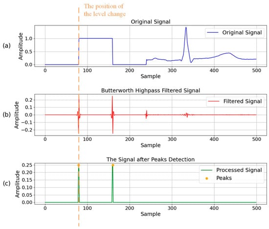 The array contains two main parts: the reference square wave signal and the ECG signal. The former is used as the reference source for the latter to convert into the original ECG amplitude sequence. This study employs a second-order Butterworth high-pass filter with a cutoff frequency of 100 Hz to identify the square wave components within the signal. The frequency range of ECG signals is approximately 0.05–100 Hz. Consequently, after applying a high-pass filter with a cutoff frequency of 100 Hz, the ECG signal is significantly suppressed, while the higher frequency signal at the transitions of square waves is retained, as illustrated in Figure 4b. For a square wave with a high level of 1 mV, the waveform produced after high-pass filtering exhibits a peak amplitude of about 0.25 mV. By taking the absolute value of the filtered signal and setting amplitudes below 0.2 mV to zero, the signal depicted in Figure 4c was obtained. Moreover, the peaks of this signal coincide with the transition points of the square wave levels. The durations of the high level and the low level in the square wave are equal. Therefore, according to the high-level width of the square wave, the starting recording point of the physiological data is at the end point of the square wave signal. Ultimately, an ECG signal data, denoted as , can be acquired subsequent to the exclusion of the square wave component from the array .