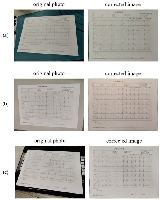 The algorithm tests the effect of distortion correction in different shooting environments and backgrounds and selects a representative to show the effect of the algorithm from Figure 6a–c. In Figure 6a, the algorithm takes the images taken in the monotonous environment as the extraction object. The example in this shooting scene can be used as the embodiment of the performance of the correction algorithm in the general background. Figure 6b shows an ECG drawing immersed in a pure white background, which may result in a lack of edge detection. However, the algorithm in this study also corrects the drawing well. Figure 6c is used as the verification of ECG drawing interception and correction under a complex background. The outer outline of the drawing is connected to many invalid edges and some of the edges are connected to the white part of the background, leading to redundancy or missing contours. Nevertheless, the algorithm still accurately identifies the four vertices of the drawing and corrects them, thereby demonstrating the robustness of the core vertex search algorithm.