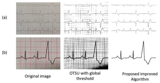 In addition, Figure 7b and Figure 8a show that the image loses information due to having a weak or strong uneven light distribution after binarization. The phenomenon of image loss in Figure 8a is the most serious case since it was specially photographed in an environment with uneven light. The algorithm proposed in this study, which is capable of independently obtaining local separation thresholds for both high-brightness and low-brightness regions in images, can correctly extract the curves in the inhomogeneous illumination image shown in Figure 8a. Figure 8b is a special group because it is part of the complete 10 s clinical ECG thermal paper captured by the mobile phone after distortion correction. The result after OTSU with global threshold processing had many background grids that were mistakenly regarded as part of the ECG curve, which is disastrous for subsequent digitization algorithms. The proposed algorithm can effectively extract the correct and complete multi-lead ECG curve with a pure background.