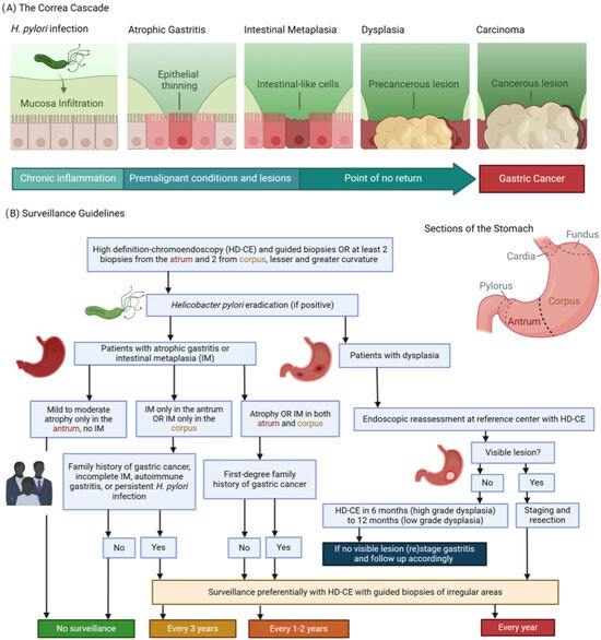 (A) The Correa’s cascade of intestinal type gastric carcinogenesis: a sequence of gastric changes from chronic gastritis to atrophic gastritis, then to intestinal metaplasia and dysplasia, culminating in gastric cancer, highlighting a progressive, stepwise development toward malignancy. (B) Surveillance guidelines overview [2]: (1) Detection and Diagnosis: Endoscopy provides a direct view of the stomach lining, enabling the identification of areas that may exhibit precancerous alterations. During this examination, targeted biopsies are collected from visually abnormal or suspicious regions. (2) Pathological Analysis: These biopsies are meticulously analyzed by pathologists to categorize the cellular composition of the tissue. This examination distinguishes between normal cells, atrophic gastritis, intestinal metaplasia, dysplasia, or the early stages of gastric cancer. The results are used for confirming the diagnosis and assessing the condition’s severity. (3) Guiding Management: Insights derived from endoscopic findings and pathological reports are integral to formulating a management strategy. Decisions regarding the frequency of surveillance, the need for further medical interventions, and evaluations of the risk for progression to gastric cancer are based on these combined observations and individual risk factors such as genetic predispositions.
