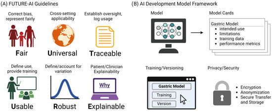 (A) The FUTURE-AI guidelines. (B) Proposed Model Cards Framework.