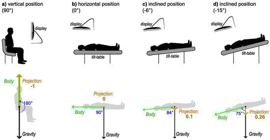- Vertical position (90° angle with the horizontal plane). The participant was seated on a regular office chair and observed the visual stimuli on a monitor that was positioned so that the normal line in the center of the monitor was aligned to the midpupillary point (the middle point between the eyes). This was considered the reference position for normal daily activities. In microgravity analogue studies, positions where the head is above the horizontal line are usually called “head-up tilt” (HUT) position. Therefore, this position would be 90° HUT;