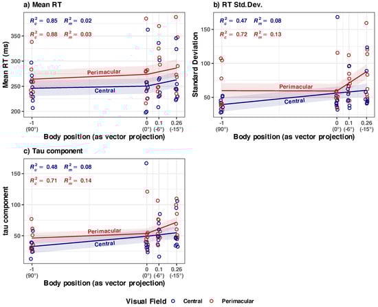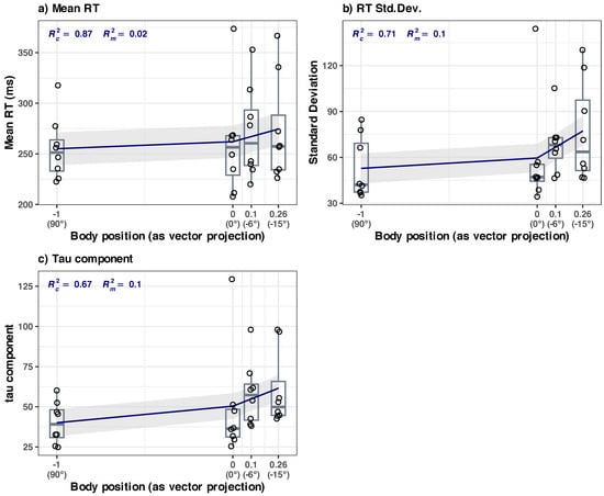 - (a) Mean RT at the group level (Figure 6a) The LME model of the mean RT as a function of the body position has the following R formula: Mean ~ bs(BodyPosition, knots = c(0), degree = 1) + (1|ID). The model included ID as a random effect (formula: ~1|ID).