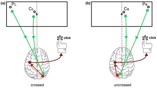 - Iacoboni, M.; Zaidel, E. Crossed–uncrossed difference in simple reaction times to lateralized flashes: Between- and within-subjects variability. Neuropsychologia 2000, 38, 535–541. [Google Scholar] [CrossRef] [PubMed]