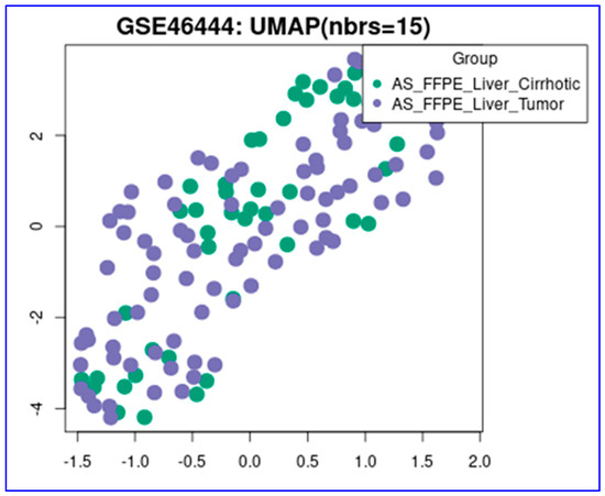 In the GSE46444 data set, 48 cirrhotic liver tissue and 88 HCC tumor tissue samples were compared for gene expression using transcriptomic microarray analysis on the FFPE tissues. Following normalization, sample heterogeneity was high regardless of the groups, as shown by the UMAP (Uniform Manifold Approximation and Projection) cluster analysis (Figure 1).