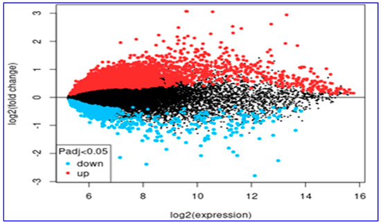 The MA graph of the upregulated (red dots) and downregulated (blue dots) genes in the cirrhotic tissues compared to HCC tissues. The black dots show the genes that did not differ in expression between the cirrhotic and HCC tissues (HCC: hepatocellular carcinoma).