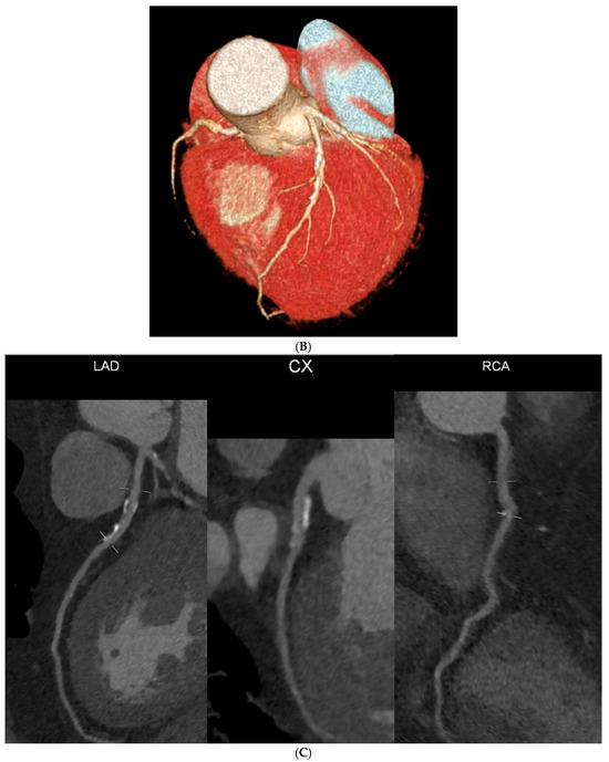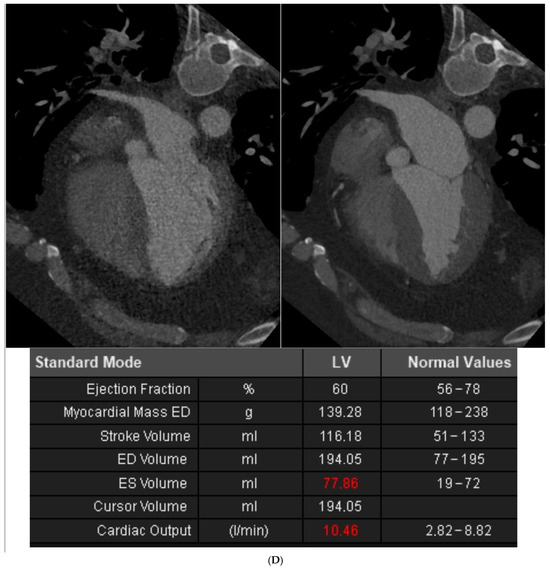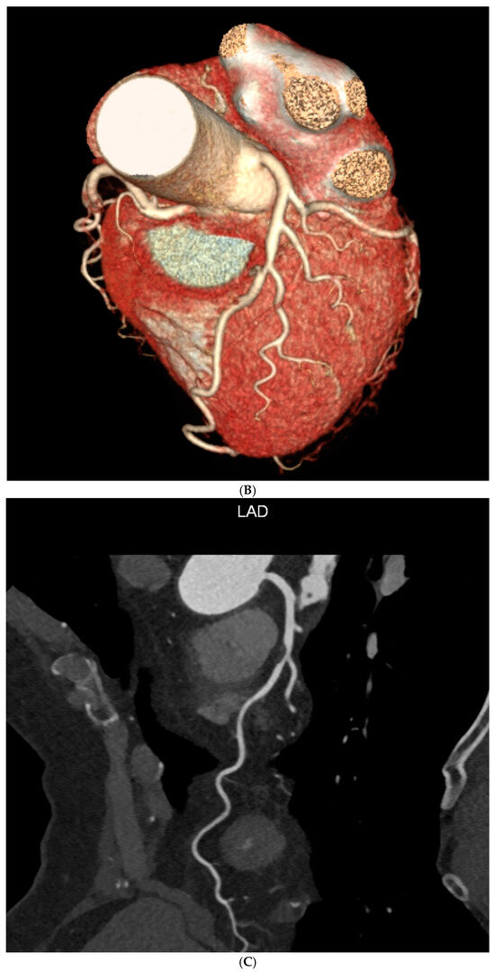 Case 2. A high CACS without significant coronary artery stenosis in CCTA. A 57-year-old male patient was referred for computed tomography angiography of the coronary arteries from the outpatient cardiology clinic due to numerous risk factors for cardiovascular disease in their medical history and sudden cardiac death in the family. CCTA examination was performed according to the standard protocol. (A) The native phase of CCTA revealed the presence of calcified changes in the topography of coronary arteries. The calcium index of individual coronary arteries calculated using the Agatston method was LM 0, LAD 403, LCx 207.7, RCA 12. The CACS was 622.7, representing a significant population risk of significant CAD. (B) Computed tomography volumetric reconstruction technique. The quality of the obtained images of the angiographic phase of the CCTA examination was assessed as average. The average quality of CCTA images was the result of the patient’s obesity and fast heart rate during acquisition.). (C) Curved multiplanar reconstructions (cMPR). LM was short, without stenosis. In the proximal and middle sections of the LAD, numerous calcified and mixed atherosclerotic plaques with positive remodeling were visible, causing stenosis of 25–50%. Similarly, in the proximal and middle sections of the LCx, numerous calcified and mixed atherosclerotic plaques with positive remodeling were visualized, causing stenoses of 25–50%. Calcified atherosclerotic plaques were found in the RCA, causing stenosis <25%. The entire CCTA image met CAD-RADS 2 criteria. (D) Assessment of left ventricular functional parameters. The left ventricular ejection fraction was 60%, the left ventricular end-diastolic volume was 194.05 mL, and the left ventricular mass was 139.28 g. The left ventricle was not enlarged and had normal global systolic function. In further diagnostic and therapeutic procedures, due to the occurrence of increasing chest pain, it was decided to verify the coronary arteries via invasive coronary angiography. Invasive coronary angiography excluded significant stenoses in the coronary arteries.