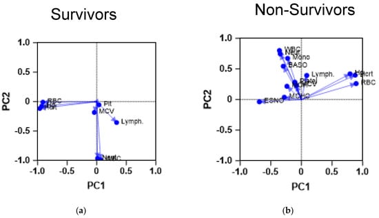 The next step was to examine the CBC results of survivors and non-survivors using PCA to assess whether they would yield similar results. Expectedly, the PCA analysis of both cohorts yielded different CBC profiles, as shown in Figure 1.
