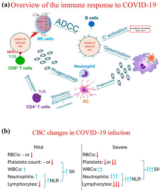 Schematic representation of overview of the immunological response to COVID-19 and the associated changes observed in a CBC in cases of COVID-19. (a) Demonstrates an overview of the immune response, both the innate (through phagocytes, NK cells, and complement system through its classical pathway triggered by the antigen-antibody complext) and adaptive immune response (T and B cells). (b) Contrasts the changes associated with the CBC indices between mild and severe COVID-19 cases, in which blue arrows mean increase and red arrow refer to a decrease, while the number of arrows highlight the degree of such an increase or decrease. Ab: Antibody, ADCC: antibody-dependent cytotoxicity, Ag: Antigen, C’: complement, DC: dendritic cells, MHC: major histocompatibility complex receptor, NK: natural killer, NLR: neutrophil-to-lymphocyte ratio; RBC: red blood cell; SII: systemic immunoinflammatory index; TCR: T cell receptor, WBC: white blood cell.