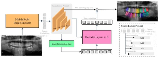 The network gradient episodic memory (GEM) [19], previously designed and investigated by our team for segmentation tasks in the domain of natural images, was applied for tooth segmentation and identification due to its outstanding performance in feature extraction and object segmentation. The GEM adopts a Transformer-based encoder-decoder architecture consisting of an image encoder, a simple feature pyramid, a query initialization unit, and a mask decoder, as shown in Figure 1. The image encoder was a ViT-Tiny architecture [20] with the MobileSAM pre-trained model [21] that was used to extract the features of panoramic radiographs. To boost the performance for tooth segmentation and identification, the multi-scale feature maps were produced by using the last feature map from the image encoder via a simple feature pyramid following ViTDet [22]. Specifically, the feature maps of scales 1/8, 1/4, and 1/32 were generated using deconvolution of strides 2 and 4 and max-pooling of strides 2, respectively. The feature map of scale 1/4 is directly appointed as the role of the pixel embedding map, which is used to produce the final predictions.
