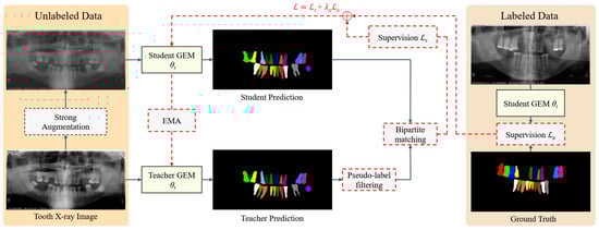 Figure 2. Workflow of the distillation stage in the semi-supervised learning strategy. The original unlabeled panoramic radiographs were fed into the teacher model, while the strongly augmented unlabeled images were fed into the student model. The student model was updated using both the supervised loss (Ls) and unsupervised loss (Lu). The teacher model was subsequently updated using Exponential Moving Average (EMA).