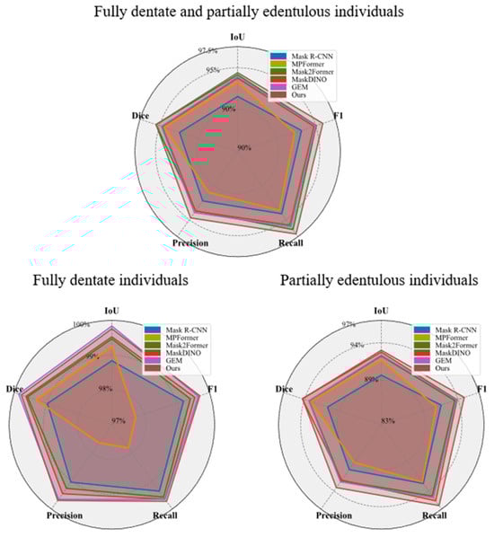 Radar charts visualizing the performance of SemiTNet in comparison to five state-of-art deep learning networks on the test set, for both fully dentate and partially edentulous individuals, as well as for fully dentate individuals and partially edentulous individuals separately.