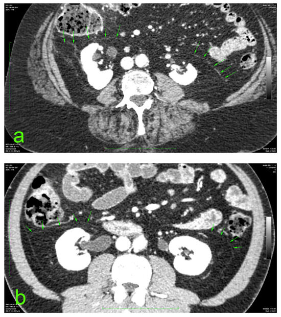 Prerenal fasciae (green arrows) on injected CT: (a) 70-year-old female patient with a BMI of 32.9; (b) 50-year-old male patient with a BMI of 30.1.