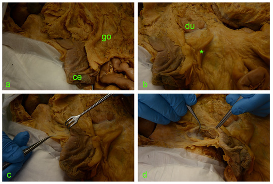 (a) ce—cecum; go—greater omentum covering the intestinal loops. (b) Asterisk—ileocecal fold; du—duodenum. (c) Israel retractor pulling the ascending colon medially, exposing the paracolic peritoneal fusion line (a.k.a. white line of Toldt). (d) Incision of the peritoneum along the white line of Toldt and exposure of the retrocolic space.