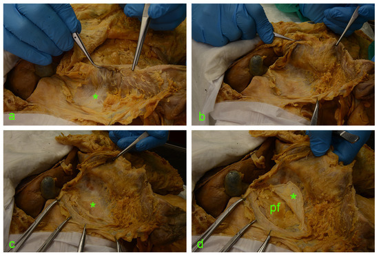 (a) asterisk—fusion fascia of Toldt with a ‘hair-like’ aspect. (b) fusion fascia of Toldt pulled along with the ascending mesocolon to the left. (c) Full exposure of the right retrocolic space; under the fusion fascia lies the anterior renal fascia (asterisk). (d) A vertical incision was made along the the Gerota’s fascia (asterisk); cutting through this connective tissue envelope allows visualization of the perirenal adipose tissue (pf).