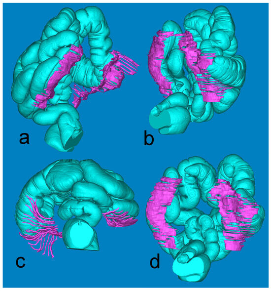 Mimics reconstruction of the large bowel (turquoise) and the adjacent retrocolic fascia (fuchsia). Views: (a) left oblique; (b) right oblique; (c) axial, from below; (d) coronal, posterior.