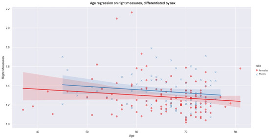 Age regression on right measures, differentiated by sex (blue xs, lines and shadows = males, red dots, lines and shadows = females; line—mean, shadow—SD.