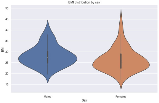 Violin plot showing BMI distribution by sex.