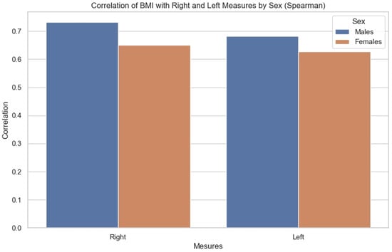 Bar chart showing correlation of BMI with right and left measurements by sex (Spearman correlation).