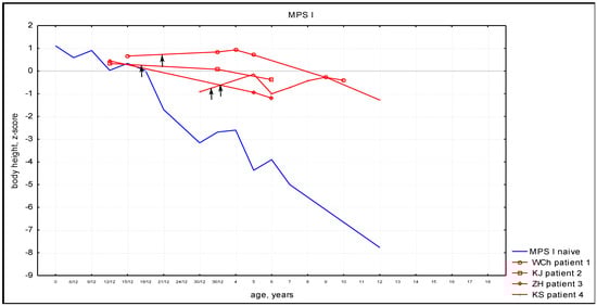 Body height of MPS I patients after HSCT (red lines; arrow—time of HSCT) with comparison with untreated patients (blue line).