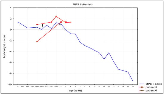 Body height of MPS II patients after HSCT (red lines; arrow—time of HSCT) with comparison with untreated patients (blue line).
