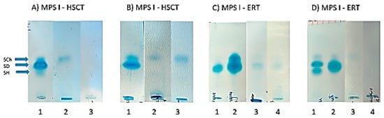 Changes in GAG electrophoresis in MPS I patients after HSCT and ERT. Abbreviations: SCh—chondroitin sulphate; SD—dermatan sulphate; SH—heparan sulphate; GAG—glycosaminoglycan; ERT—enzyme replacement therapy; HSCT—hematopoietic stem cell transplantation. (A) 1—before treatment; 2—after 2 years of HSCT; 3—after 4 years of HSCT. (B) 1—before treatment; 2—after 2 years of HSCT; 3—after 3 years of HSCT. (C) 1—before treatment; 2—control sample; 3—after 11 years of ERT; 4—after 21 years of ERT. (D) 1—control sample; 2—before treatment; 3—after 11 years of ERT; 4—after 21 years of ERT.