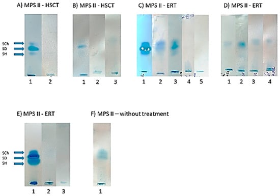 Changes in GAG electrophoresis in MPS II patients after HSCT and ERT. Abbreviations: SCh—chondroitin sulphate; SD—dermatan sulphate; SH—heparan sulphate; GAG—glycosaminoglycan; ERT—enzyme replacement therapy; HSCT—hematopoietic stem cell transplantation. (A) 1—before treatment; 2—after 9 months of HSCT. (B) 1—before treatment; 2—after 3 years of HSCT; 3—after 3 years and 4 months of HSCT. (C) 1—before treatment; 2—after 7.5 years of ERT; 3—after. 2.5 years of ERT; 4—after 16 years of ERT; 5—after 21 years of ERT. (D) 1—before treatment; 2—after 1.5 years of ERT; 3—after 3 years of ERT; 4—after 4.5 years of ERT. (E) 1—before treatment; 2—after 6 years of HSCT; 3—after 10 years of HSCT. (F) 1—MPS II without treatment.