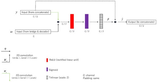 where is an element-wise nonlinearity (rectified linear unit, ReLu) and is a normalization function (sigmoid). The input feature is (from concatenate, H: height, W: width, and C: channel) and (from bridge & decoder, ). , which is the grid resampling of attention coefficients, is performed using trilinear interpolation with linear transformations (, ) (Figure 1).