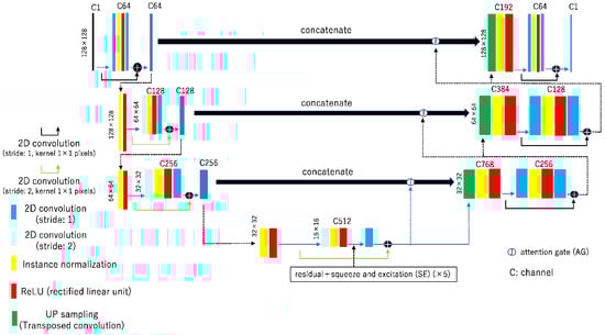 Based on recent studies, attention mechanisms have been adopted in deep learning to improve image recognition and classification accuracy [26,27,28]. Attention calculates the dot product of the vector corresponding to the original feature map. Then, with respect to the generated coefficients and the feature map (part) of the next output layer, coefficients are made larger for areas with a strong association and smaller for areas with a weak association. Using this attention mechanism, a feature map that emphasizes the target region of interest can be generated. In a conventional convolutional neural network (CNN), learning ranges from simple patterns between pixels to complex patterns for input images. However, the attention mechanism realizes the learning of complex relationships from simple relationships among multiple feature maps. Therefore, by incorporating this attention mechanism into a part of the generator network, the identification accuracy of the feature map of each layer can improve and contribute to obtaining a better final target image. In addition, another study has reported that incorporating an additive attention gate (AG), which is a developed attention mechanism between U-Net system skip connections, is useful [26].