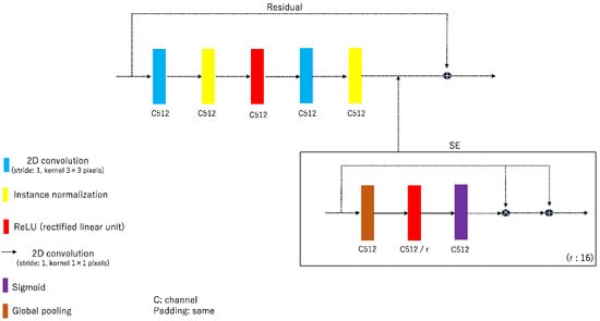 The novel feature of rSEAG is that it incorporates a cycleGAN-based generator network with a residual network, SE network, and an AG based on ResUNet (Figure 2). The key to the SE network is to apply weights adaptively, not to output each channel of the convolutional layer equally. Therefore, the input of the SE block can inherently introduce conditioning dynamics to improve the ability to identify features (Figure 3). The configuration combines with the SE network to identify the local features of the images. AG, which is an image recognition model that extracts features from the whole image, was utilized to improve the accuracy of identification.