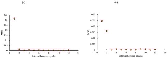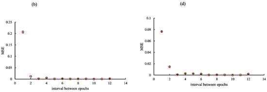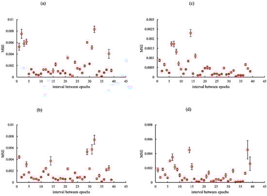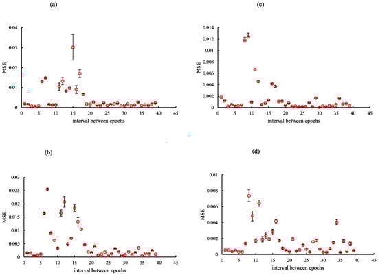 Optimization results for parameter (epoch) determination for cycle-consistent generative adversarial network pre-reconstruction processing (generator network, U-Net) of different cases. (a) case_1, (b) case_2, (c) case_3, and (d) case_4. The horizontal axis shows the interval between epochs.