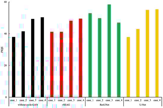 Figure 11 depicts the comparison results of PIQE for each case using a network without cycleGAN and each tested network. Compared with networks without cycleGAN, rSEAG had the lowest value among the conventional networks on all but case_1. Compared with networks without cycleGAN and rSEAG, rSEAG showed that the non-dense breasts type had a lower value. RSEAG reduced the distortion caused by artifacts and noise compared with conventional networks and networks without cycleGAN, excluding dense type cases (case_1 of network without cycleGAN and U-Net) and one non-dense type (case_4 of ResUNet).