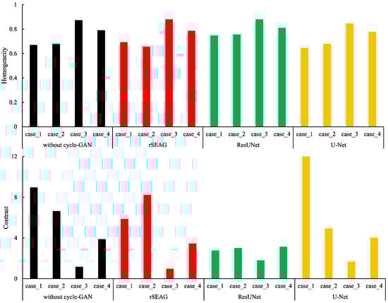 Results of the texture analysis (feature: “Homogeneity” and “Contrast”) versus each testing case. Plots of the “Homogeneity” and “Contrast” for the in-focus plane at the cycle-consistent generative adversarial network (cycleGAN) pre-reconstruction processing with and without relative generator networks (network without cycleGAN, residual squeeze and excitation attention gate network [rSEAG], ResUNet, and U-Net) and each testing case. (Black: without cycle-GAN, Red: rSEAG, Green: ResUNet, Yellow: U-Net).