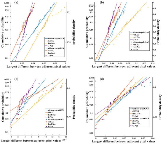 Figure 13 presents the Gumbel plot of the associations between the maximal variations ± standard error and predicted cumulative probabilities (case_1: without cycleGAN = 0.0490 ± 0.0030, rSEAG = 0.0248 ± 0.0016, ResUNet = 0.0632 ± 0.0033, and U-Net = 0.0277 ± 0.0013; case_2: without cycleGAN = 0.0507 ± 0.0026, rSEAG = 0.0406 ± 0.0022, ResUNet = 0.0777 ± 0.0044, and U-Net = 0.0365 ± 0.0017; case_3: without cycleGAN = 0.0054 ± 0.0004, rSEAG = 0.0056 ± 0.0008, ResUNet = 0.0085 ± 0.0006, and U-Net = 0.0038 ± 0.0002; case_4: without cycleGAN = 0.0292 ± 0.0024, rSEAG = 0.0237 ± 0.0019, ResUNet = 0.0250 ± 0.0020, U-Net = 0.0248 ± 0.0023). Here, the largest variations were linearly distributed (case_1: without cycleGAN, r = 0.990 [p < 0.01]; rSEAG, r = 0.990 [p < 0.01]; ResUNet, r = 0.963 [p < 0.01]; U-Net, r = 0.961 [p < 0.01]; case_2: without cycleGAN, r = 0.963 [p < 0.01]; rSEAG, r = 0.965 [p < 0.01]; ResUNet, r = 0.979 [p < 0.01]; U-Net, r = 0.933 [p < 0.01]; case_3: without cycleGAN, r = 0.923 [p < 0.01]; rSEAG, r = 0.847 [p < 0.01]; ResUNet, r = 0.977 [p < 0.01]; U-Net, r = 0.943 [p < 0.01]; case_4: without cycleGAN, r = 0.960 [p < 0.01]; rSEAG, r = 0.935 [p < 0.01]; ResUNet, r = 0.983 [p < 0.01]; U-Net, r = 0.953 [p < 0.01]). These observations validated the use of a Gumbel distribution as an acceptable statistical model for defining the largest variations in the nearby pixel-value profiles. In addition, based on an analysis of the maximal variations in the Gumbel plot, rSEAG had the lowest high-frequency ripple artifacts for case_1, case_2, and case_3. The ResUNet exhibited the highest high-frequency ripple artifacts. However, the distribution differed in other networks.