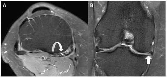 MRI of the right knee of a 31-year-old male patient who presented with medial-sided knee joint pain. Sagittal Proton Density Fat Saturated (A) and axial Proton Density Fat Saturated (B) MRI images demonstrate medial meniscal tear (arrow), posterior mensicocapsular separation (curved arrow), and semimembranosus tendinosis (chevron).