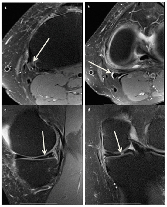 MRI scan of the left knee of a 34-year-old male patient who presented with medial sided knee pain and swelling. (a) Axial Proton Density Fat-Saturated MRI image, which demonstrated semimembranosus tendinosis (white arrow). (b) Axial Proton Density Fat Saturated image superior to (a) demonstrating presence of fluid within the semimembranosus bursa in keeping with bursitis (white arrow). (c,d) Sagittal and coronal Proton Density Fat Saturated MRI images, respectively, which demonstrate complex medial meniscal tear with horizontal and radial components involving the body and posterior horn (white arrow).