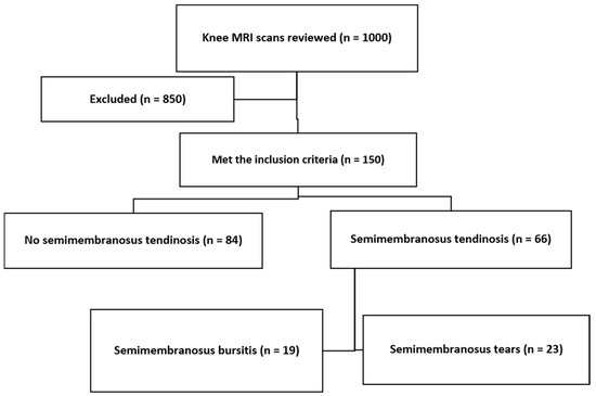 Flowchart of patients demonstrating semimembranosus changes, including tendinosis, tears, and bursitis.